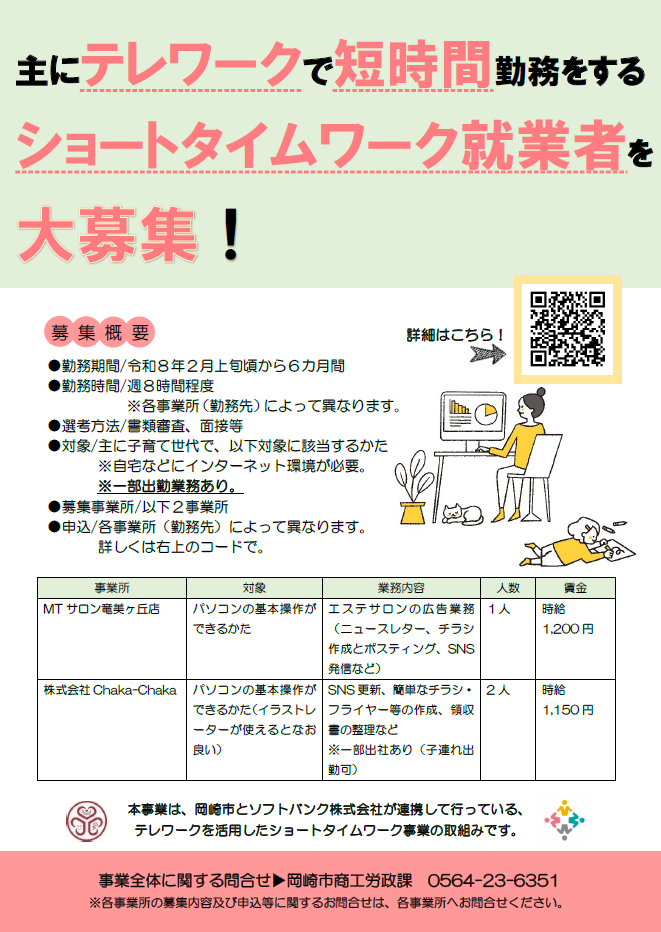 主にテレワークで短時間勤務をするショートタイムワーク就業者を募集します。