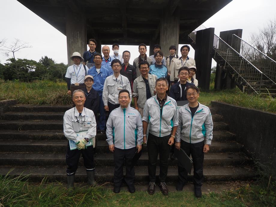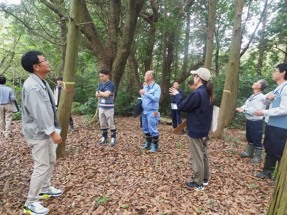 岡崎市雨山町にて取り組まれている、天使の森プロジェクトの理事長に講師を依頼し、23名で森林保全の取組みの視察および植樹を実施しました。間伐を実施した森林としていない森林の見比べ、9年前から毎年行っている皆伐と植樹の経過を見学しました。山頂にて、三河湾を望みながら集合写真を撮り、拠点となる建屋でプロジェクトの経緯や取り組み内容について教えてもらいました。今後の活動のイメージを膨らませる活動となりました。