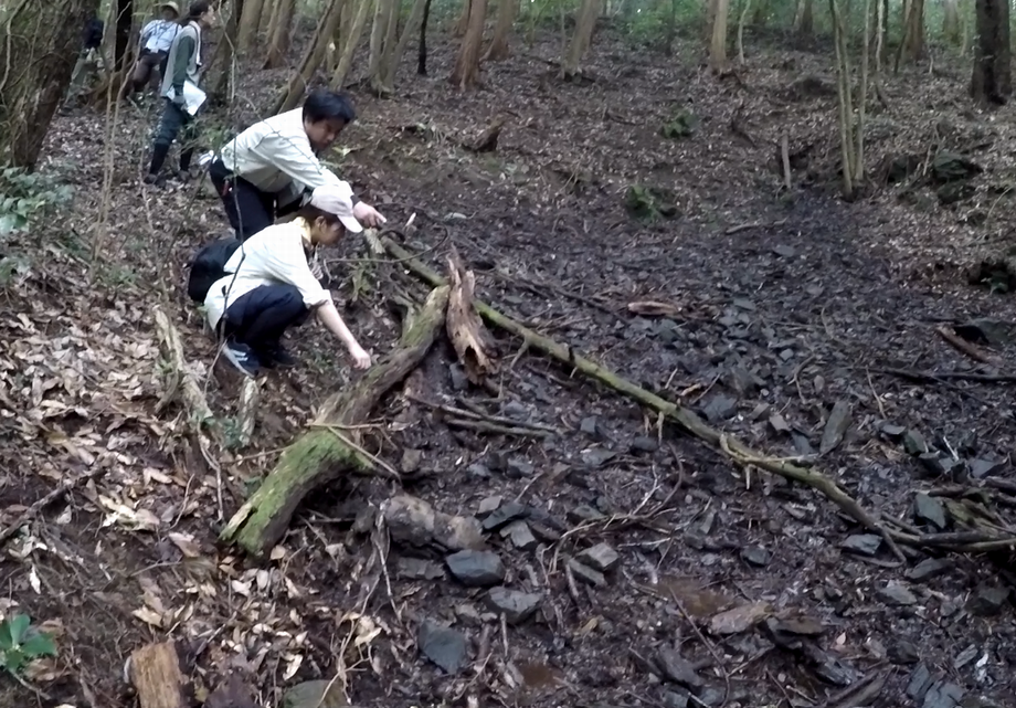 (写真左:森の中の水源を指さす様子、写真右:集合写真)