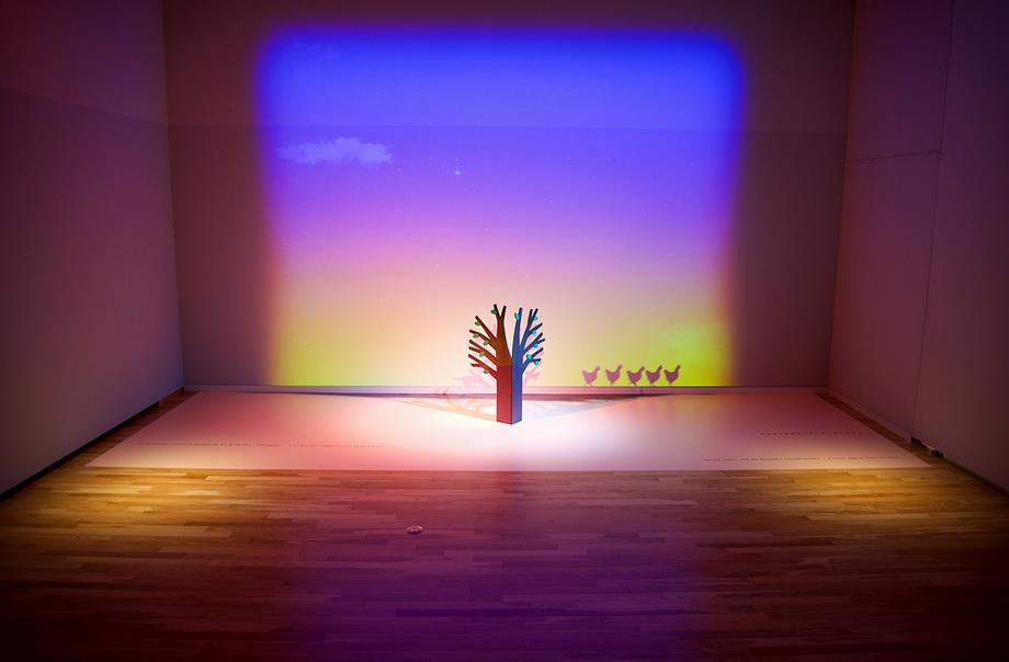 ▼上田市立美術館「え!ほん展」会場風景(「Little tree」映像,『Yellow to Red』, 『かぜがはこぶおと』 )