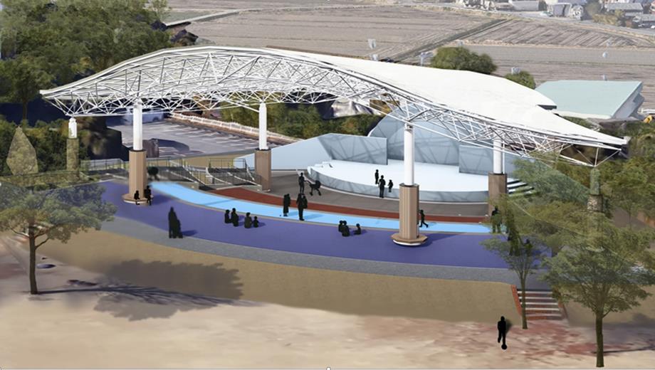 令和7年10月末に、子どもたちが天候に左右されずに、強い日差しを避け、家族や友だちとお弁当を食べたり、遊んだり、また、イベントなどを楽しむことができる空間として、大屋根が完成する予定です。