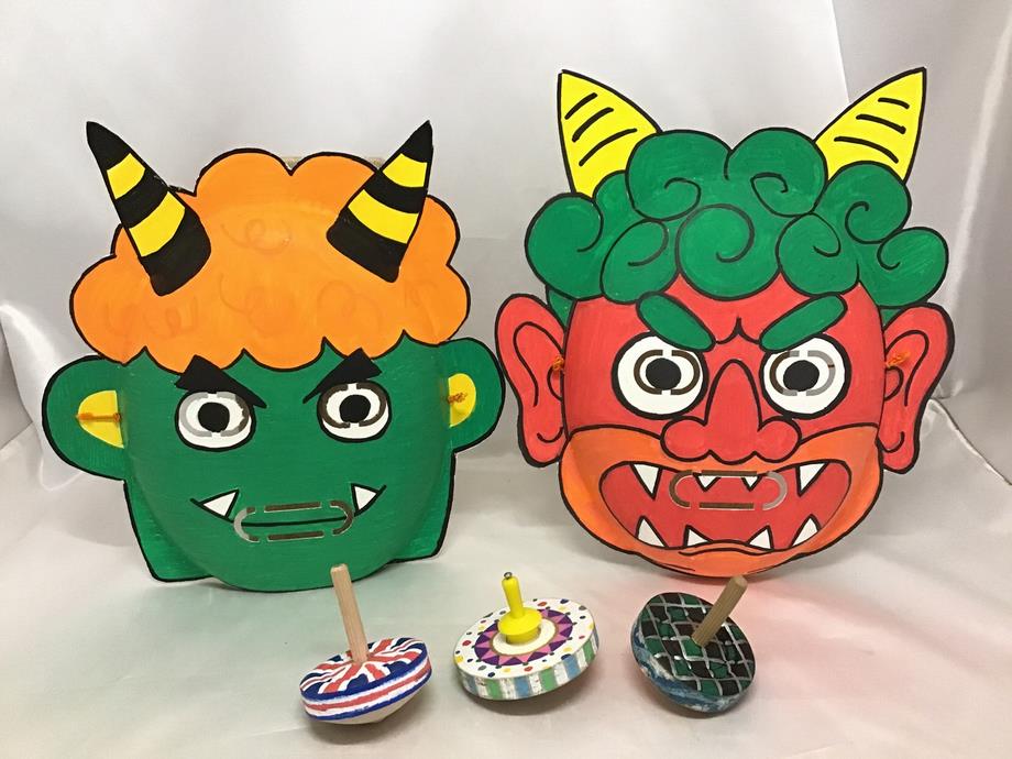好きな色を塗ってオリジナルのこまや鬼のお面を作る。こまは手回しと糸回しが選べます。