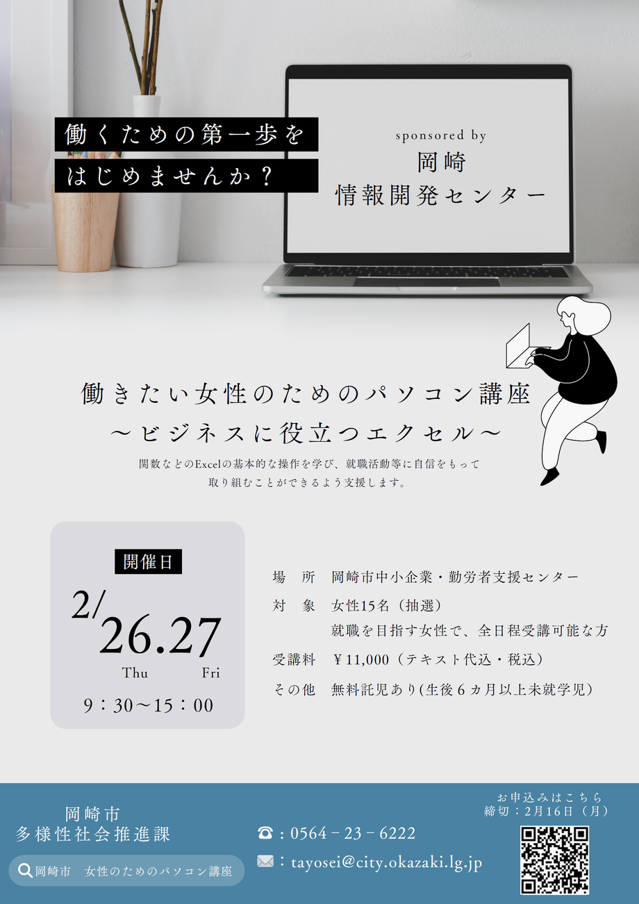 求職活動実績対象事業「働きたい女性のためのパソコン講座~ビジネスに役立つエクセル~」を開催します!