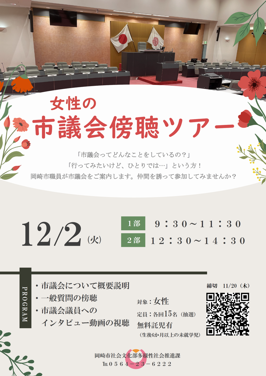 女性に政治分野への興味・関心を持っていただくことを目的に、気軽に参加できるツアーとして岡崎市議会を傍聴するイベントを開催します。