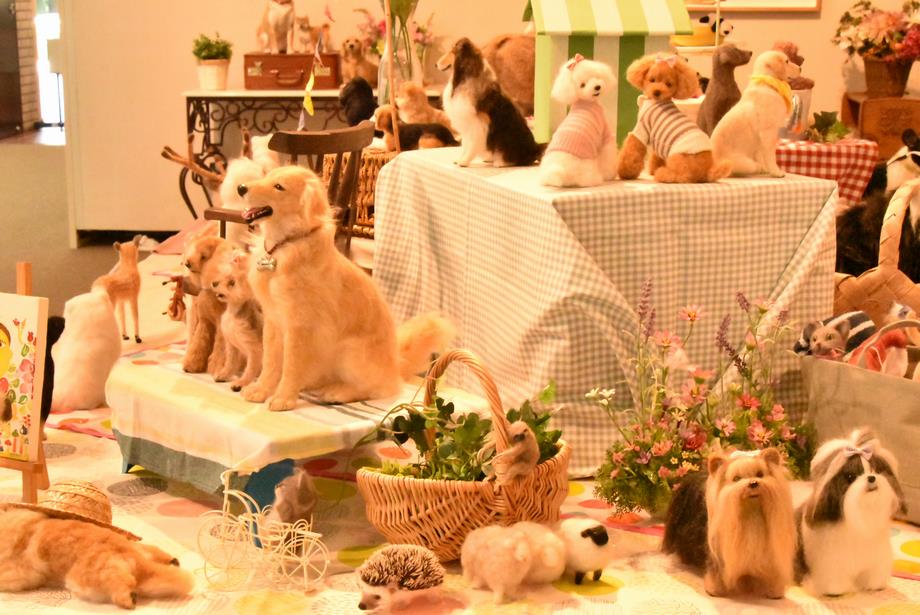 フェルトアート展には犬や猫をはじめとした様々な動物たちがたくさん展示されています。表情やポーズが本物の動物と間違えてしまうほどで、今にも動き出しそうです。展示方法にも楽しめる工夫がされており、展示台だけでなく、空中や壁にも展示されている作品を来場した皆さんも楽しんでいました。